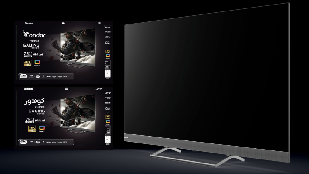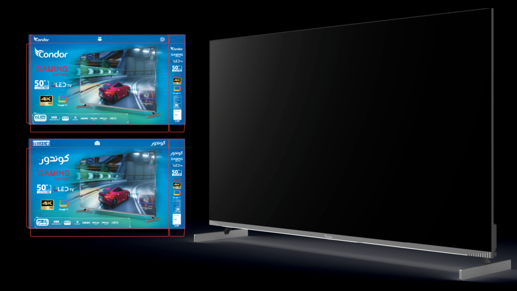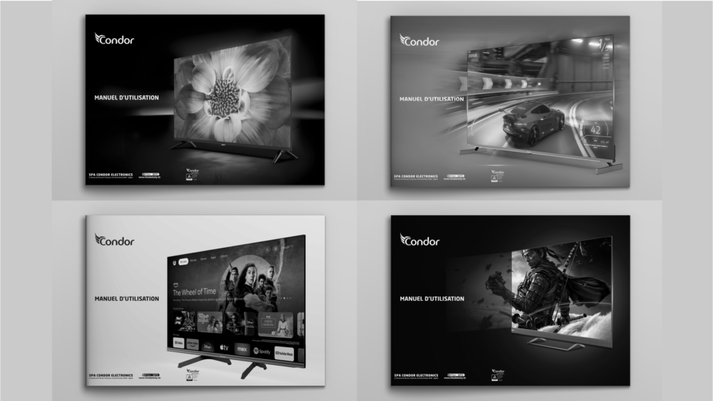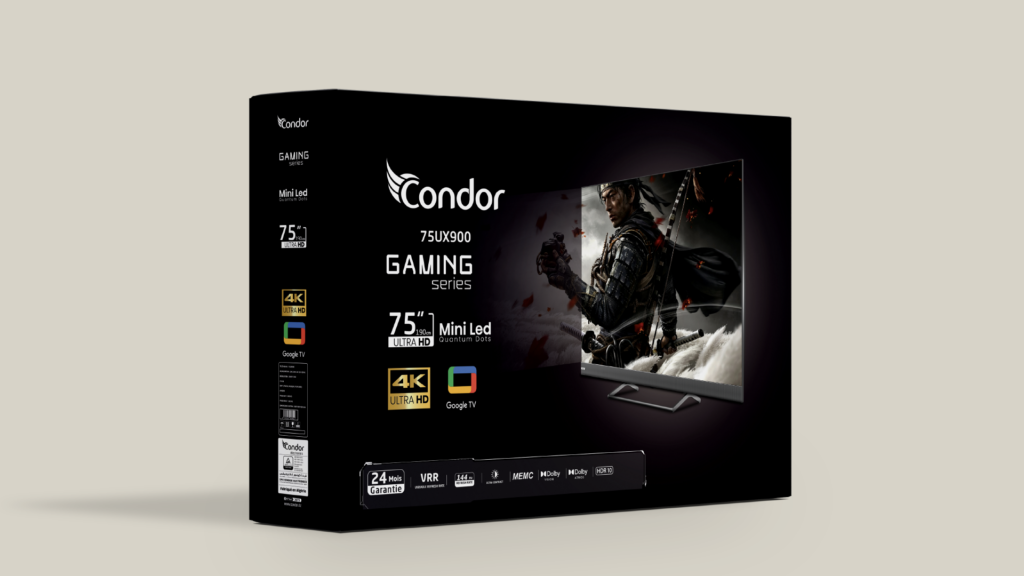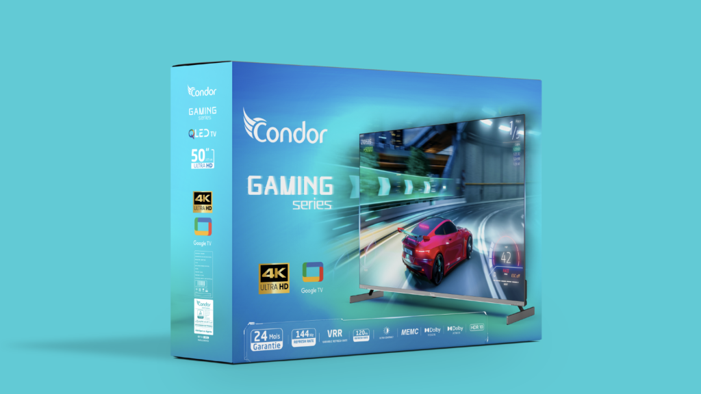 Pour Condor Electronics, nous avons conçu le packaging de leur Smart TV, en mettant l’accent sur l’élégance, la modernité et l’expérience client. L’objectif était de créer un emballage qui reflète la qualité du produit tout en se démarquant visuellement sur le marché.