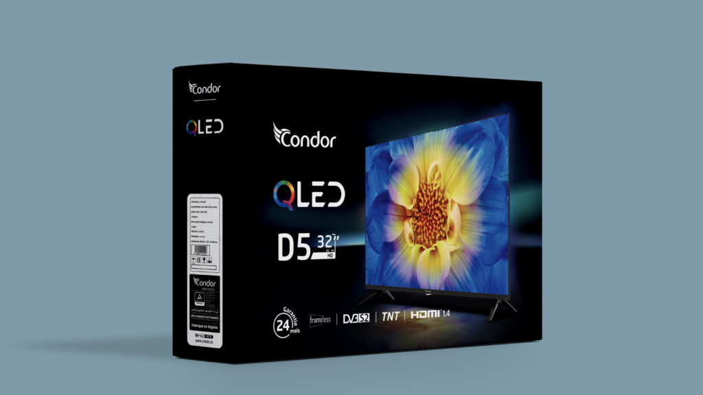 Notre mission était de transformer le packaging en un vecteur de valeur pour la marque. Nous avons travaillé sur un design clair et impactant, harmonisant couleurs, typographie et visuels pour communiquer immédiatement la performance et la modernité de la Smart TV. Chaque détail a été pensé pour séduire le consommateur et renforcer l’image innovante de Condor Electronics.